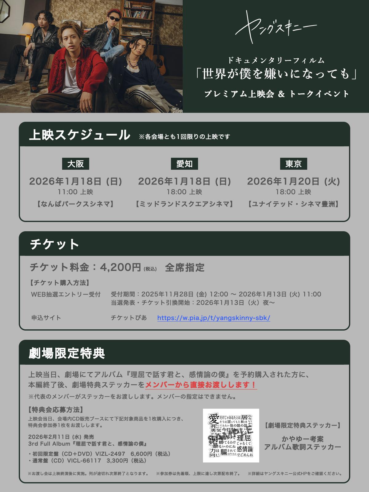 ヤングスキニー 3rdフルアルバム『理屈で話す君と、感情論の僕』の発売を記念して、初のドキュメンタリーフィルム『世界が僕を嫌いになっても』の先行上映会&トークイベントの開催が決定!